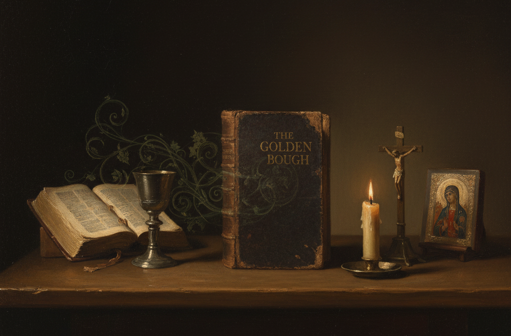 One of the main furniture‑arrangers was Sir James George Frazer, the author of The Golden Bough. Frazer grew up in strict Scottish Presbyterianism and later rejected Christianity altogether. He wanted to show that religion, Christian and pagan alike was an early, mistaken stage in humanity’s development, something that would eventually be swept away by science. To do that, he spun a powerful narrative: at the heart of many religions, he said, is a “dying and rising god” or sacred king, whose death and rebirth guarantees the fertility of the earth and the survival of the tribe.