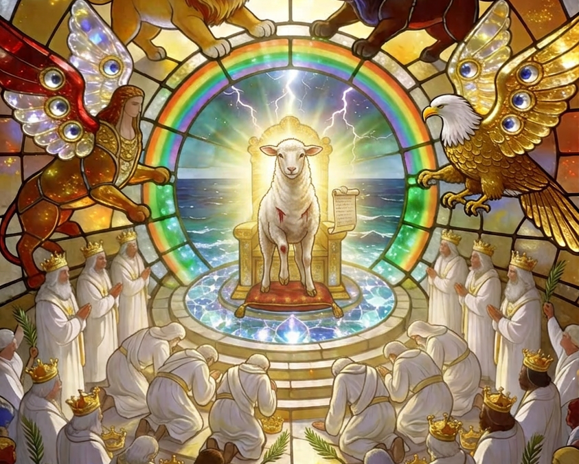 Imagine the transcendent majesty of God’s throne, resplendent in jasper, carnelian, and an emerald rainbow encircling its glory, surrounded by a vast crystal sea and flashes of lightning that proclaim His eternal power. At its center stand the four living creatures, lion, ox, man, and eagle (the 4 images associated with each of the Gospel accounts), covered with eyes signifying divine omniscience, each with six wings veiling their forms as they ceaselessly intone, “Holy, holy, holy is the Lord God Almighty, who was and is and is to come!” In reverent response, the twenty-four elders, clothed in white robes and bearing golden crowns, prostrate themselves, casting their crowns before the throne while declaring, “Worthy are you, our Lord and God, to receive glory and honor and power, for you created all things, and by your will they existed and were created.” The early church fathers, such as Irenaeus, interpreted these creatures as emblematic of animated creation itself, representing noble wildness, faithful servitude, rational humanity, and swift spiritual insight, united in perpetual praise around the divine presence. This vision models the Church’s priestly vocation: vigilant, Trinitarian doxology that shapes our earthly liturgy, inviting believers today to join heaven’s ceaseless anthem with eyes attuned to God’s holiness amid the world’s distractions.